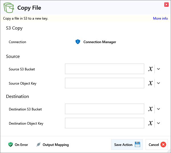 | Destination Object Key | The key in the destination S3 bucket which may include a file name change. e.g. prefix/new-file-name.file |