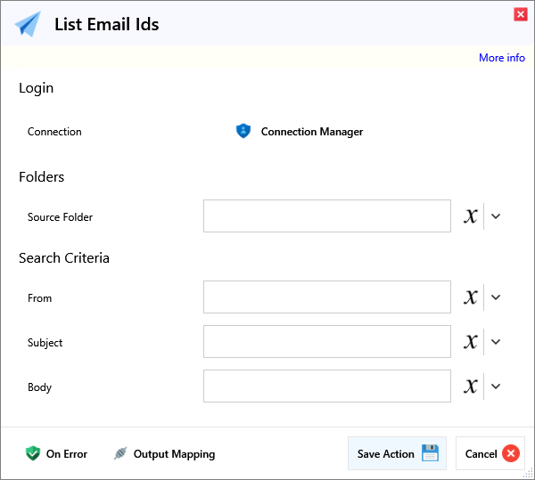 ScriptActionsEmailList Email IdsList Email IdsOverviewInputLoginNameRequiredDescriptionConnectionIMAP Connection.FoldersNameRequiredDescriptionSource FolderThe source folder of the email.Search CriteriaNameRequiredDescriptionFromThe email address of the sender.SubjectThe subject of the email.BodyThe body of the email.OutputMessage Id List Message Ids from the specified inbox