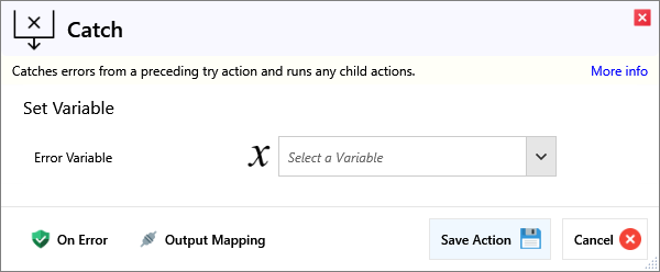 Catches errors from a preceding try action and runs any child actions.