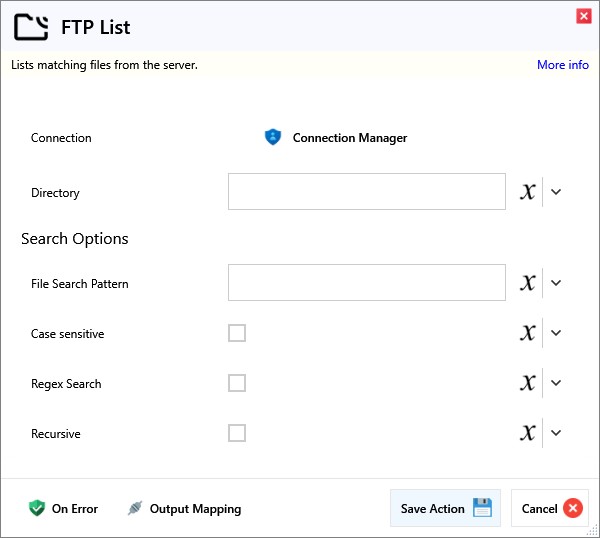 | Regex Search | Enables the file search pattern to be read as a regular expression. | |