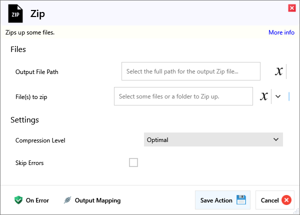 | Output File Path | This is the full path to where the Zip file will be created, any existing file with the same name there will be overwritten. | |