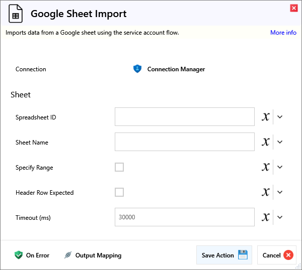 | Specify Range | Enables data range for the import. Otherwise gets all the data in the sheet. | |