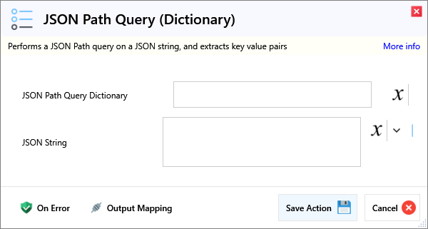 | JSON Path Query Dictionary | JSON Path expression to query the JSON string. | |