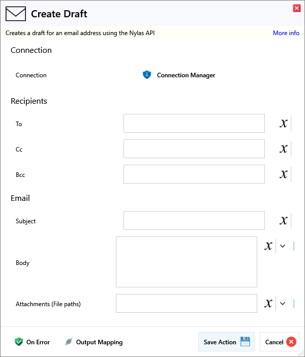 | Attachments (File paths) | The file paths for files to be attached to the email (comma-separated). |