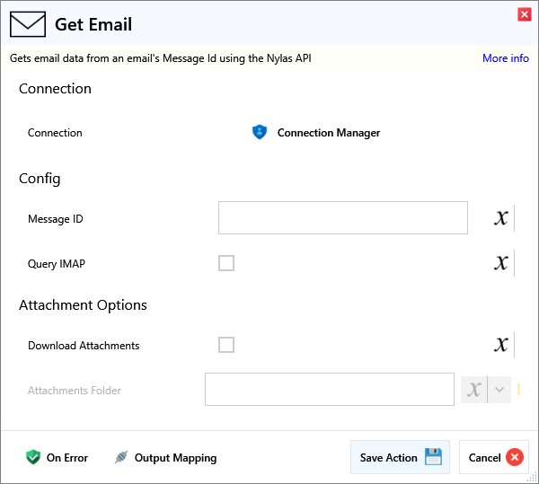 | Download Attachments | If checked, any attachments will be downloaded to the specified folder, and their paths written to the output | |