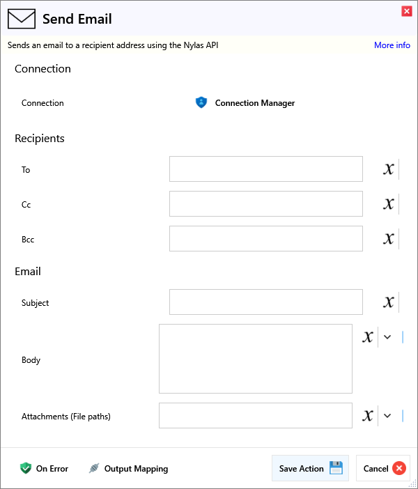 | Attachments (File paths) | The file paths for files to be attached to the email (comma-separated). |