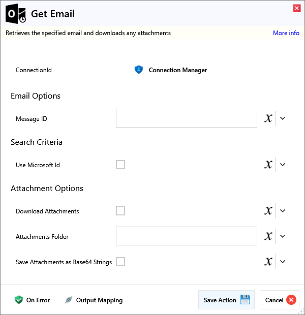 | Save Attachments as Base64 Strings | If checked, any attachments will be appended to the output as Base64 strings in place of a downloaded file path. The files will not be downloaded to the file system, but will be kept in memory |