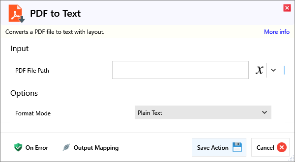 ScriptActionsPDFPDF to TextPDF to TextOverviewConverts a PDF file to text with layout.InputInputNameRequiredDescriptionPDF File PathThe path to the PDF file to convert to textOptionsNameRequiredDescriptionFormat ModeHow to format the output.OutputPDF Text The text extracted from the PDF file.