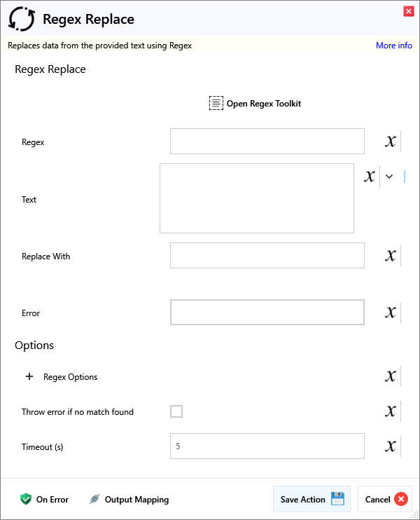|Text| |Text to replace any matches found inside with your Replace With value.| |Replace With| |Text to replace all matches found in Text.|