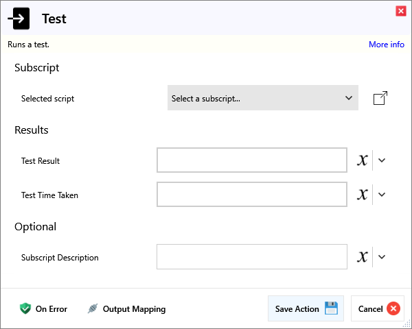 ScriptActionsSub ScriptsTestTestOverviewRuns a test.InputResultsNameRequiredDescriptionTest ResultTest Time TakenSubscriptNameRequiredDescriptionSelected scriptSelect a subscript to run.OptionalNameRequiredDescriptionSubscript DescriptionOptional, provide a custom description for this Action.OutputNameRequiredDescriptionAction SuccessTrue if the action passed, false if it failed.