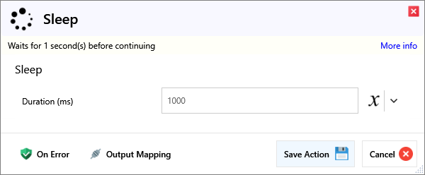| Duration (ms) | How long to sleep (wait) for, in milliseconds. |