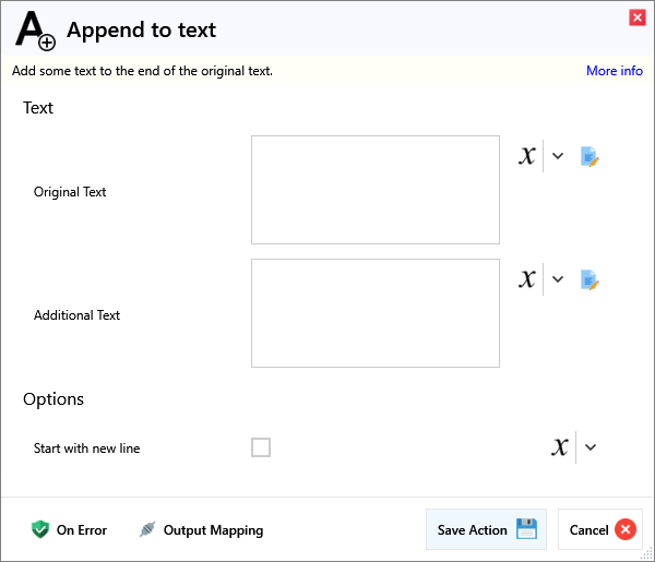 ScriptActionsTextAppend to textAppend to textOverviewAdd some text to the end of the original text.InputTextNameRequiredDescriptionOriginal TextOriginal text, to apend text to.Additional TextThe additional text, to append to the Original Text.OptionsNameRequiredDescriptionStart with new lineIf enabled, will first append a new line to the Original Text.OutputNew Text The resulting text from appending.