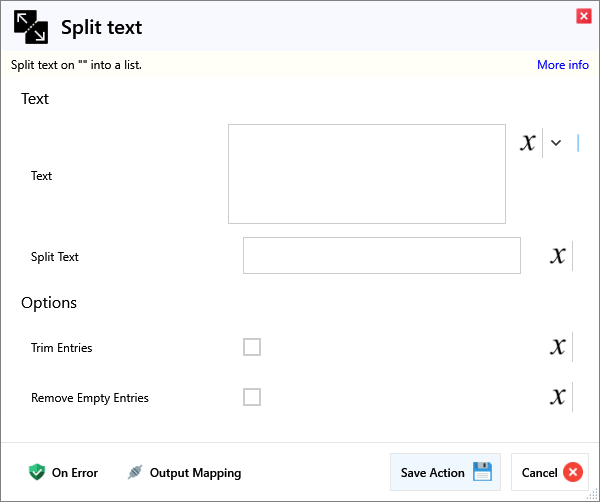 | Split Text | The character or text to split on. Eg. Item1, Item2 split on a comma will return a list with Item1 and Item2 in it. |