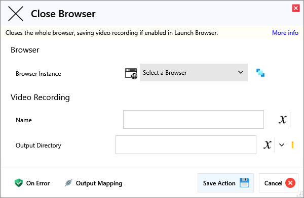 Closes the whole browser, saving video recording if enabled in Launch Browser.