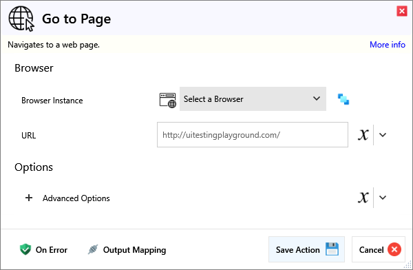| URL | The URL to navigate to, must include https:// or http://. |